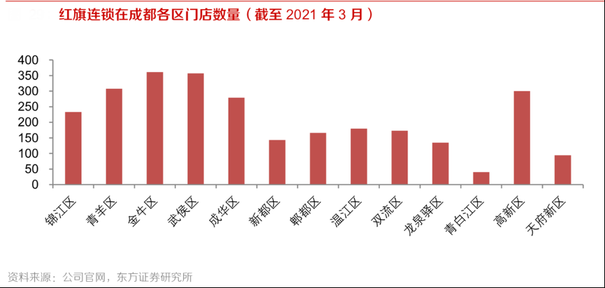 經(jīng)典案例:根據(jù)公司官網(wǎng)、東方證券研究所等綜合資訊表明,紅旗連鎖公司門店主要其中于成都市,其中92.3%都集中于成都市,7.7%分布于其他縣市。其公司在大成都范圍及周邊市區(qū)形成了網(wǎng)絡布局優(yōu)勢,同時其門店通常選址于所在城市的黃金地段或預計具有良好發(fā)展?jié)摿Φ纳倘Α?
