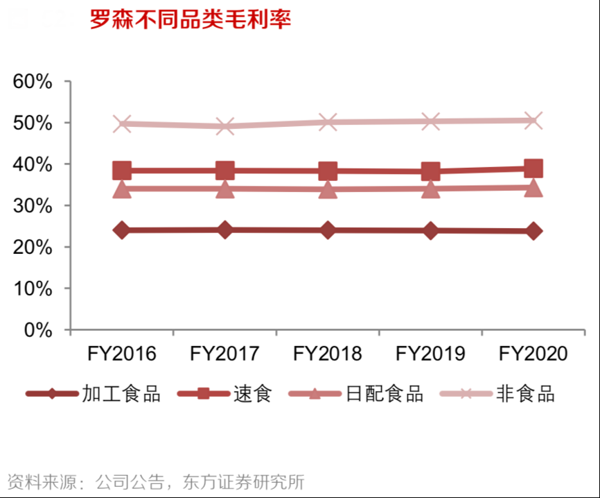經(jīng)典案例:根據(jù)公司官網(wǎng)、東方證券研究所等綜合資訊表明,從羅森的分品類毛利率來看,其加工食品毛利率僅為約 22%,而速食和日配食品毛利率分別能夠達到約 34%和 39%。