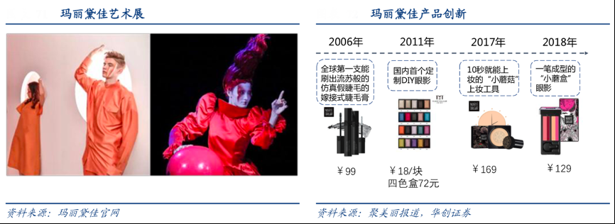 經(jīng)典案例:根據(jù)瑪麗黛佳官網(wǎng)、聚美麗報(bào)道、華創(chuàng)證券等綜合資訊表明,瑪麗黛佳有香港、日本、法國(guó)、美國(guó) 4 個(gè)全球創(chuàng)新研發(fā)中心,2006 年瑪麗黛佳首創(chuàng)全球第一支能刷出 流蘇般的仿真假睫毛的嫁接式睫毛膏,2011年推出國(guó)內(nèi)首個(gè)定制 DIY 眼影,2017 年推出 10 秒就能上妝的“小蘑菇”,2018年推出一筆成型的“小蘑盒”眼影。不同于更新包材、料體顏色和質(zhì)地的產(chǎn)品更新,瑪麗黛佳創(chuàng)新 DNA 更強(qiáng)。