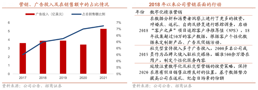 經(jīng)典案例:根據(jù)公司公告、招商證券等綜合咨詢表明,自“Path to Brilliance”戰(zhàn)略實(shí) 施以來,Signet公司加大營銷投入,營銷廣告投入占銷售額的比例均大于 6%。不斷提升公司數(shù)字化效率。同時其公司服務(wù)包含有珠寶更換計劃、永久性護(hù)理及修復(fù)服務(wù)、穿刺服務(wù)、完備的信貸金融服務(wù)、高定服務(wù)以及高端珠寶的禮賓服務(wù)等。