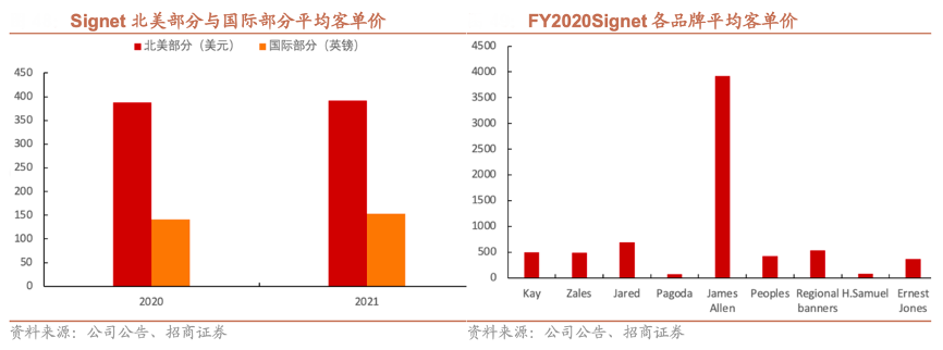經(jīng)典案例:根據(jù)公司公告、招商證券等綜合咨詢表明,Signet 大部分子品牌平均客單價在 1000 美元以下,定價較低以吸引更多的顧客,偏向“薄利多銷”。2021 財年,Signet 北美部分的客單價為 392 美元,國際部分的為 153 英鎊。Tiffany 產(chǎn)品單價在 3100-30 萬美元之間不等。相較于 Tiffany, Signet 客單價相對較低且每年的變化較小。