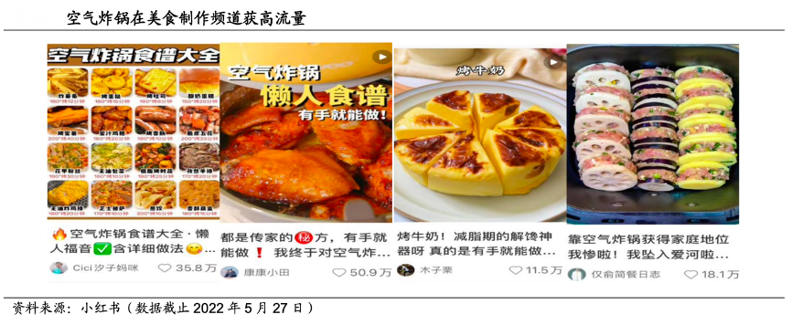 經(jīng)典案例:根據(jù)小紅書、國(guó)海證券研究所等綜合資訊表明,從內(nèi)容平臺(tái)上看,空氣炸鍋相關(guān)推文關(guān)注度高,小紅書平臺(tái)熱門筆記發(fā)布 4 個(gè)月內(nèi),單篇點(diǎn)贊量高達(dá) 51 萬(wàn)。從博主類型上看,多為美食類 KOL 分享食物制作,少有好物分享類 KOL 推薦特定品牌,市場(chǎng)存在較大挖掘空間。