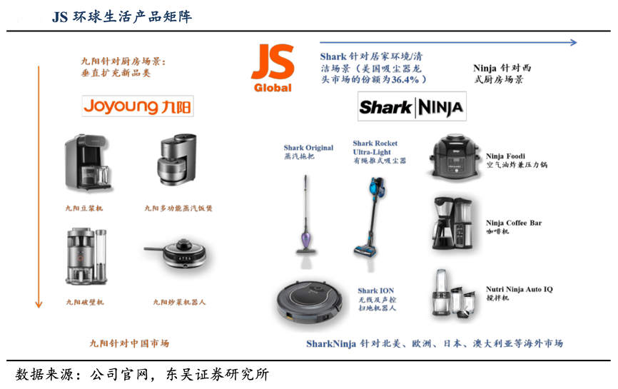 經(jīng)典案例:根據(jù)公司官網(wǎng)、東吳證券研究所等綜合資訊表明,九陽公司在產(chǎn)品拓展分為縱向和橫向擴(kuò)展兩個方向。縱向是九陽引導(dǎo)的廚房小家電場景的垂直拓展,在豆?jié){機(jī)后不斷開拓新品類成為公司新的增長引擎;橫向指通過收購 SharkNinja 開拓出居家環(huán)境場景和西式廚電場景。其集團(tuán)整體的產(chǎn)品矩陣得以完善,在實現(xiàn)多品牌運營的同時,走上小家電出海之路。