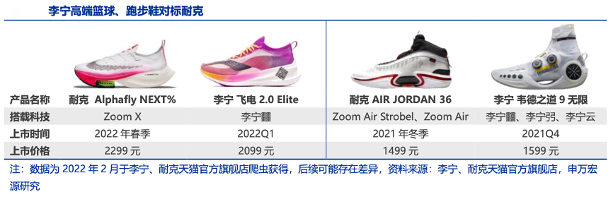 經典案例:根據李寧、耐克天貓官方旗艦店、申萬宏源研究等綜合資訊表明,李寧高端產品直接與國際品牌正面競爭。2019 年,李寧成為第一個推出以 PEBA 作為中底材 料的本土品牌,突破了耐克的封鎖,通過高價旗艦運動跑鞋打入高端運動鞋市場,并通過營銷 和良好的口碑在消費者心目中逐漸樹立國產科技值得購買,不比國外品牌差的印象。搭載“李 寧?科技”的“飛電 2.0 Elite”跑鞋、“韋德之道 9 無限”籃球鞋,在外形設計、功能屬性、價格層級等方面直接對標耐克“Alphafly NEXT%”跑鞋和“LEBRON19”運動鞋。