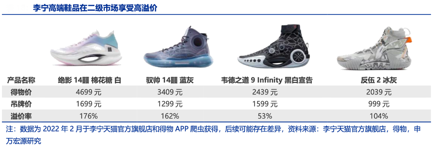 經典案例:根據李寧天貓官方旗艦店、得物、申萬宏源研究等綜合資訊表明,李寧公司在高端產品上的營銷對標國際品牌,采取饑餓營銷策略,限量發售新品。對于一些限量重磅鞋款,消費者只能通過限號抽簽的方式進行購買,部分抽簽活動只有達到金牌等級會員、且需要穿著指定系列的產品才有資格進行購買。受限于較高的購買資質及較低的中簽率,李寧高端鞋品在轉賣市場存在較高溢價,“絕影 14 ?“棉花糖配色溢價率達176%,“馭帥 14?”藍灰配色款溢價率高達162%。