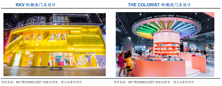 經(jīng)典案例:根據(jù)KK TECHNOLOGY招股說明書、國(guó)元證券研究所等綜合資訊 表明,以KK集團(tuán)為例,KK集團(tuán)以“小清新”的彩色元素為特點(diǎn),從空間布置、色彩搭配、產(chǎn)品陳列等維度升級(jí)門店場(chǎng)景。KKV門店采用“明黃色+集裝箱”元素的造型,以獨(dú)特的色調(diào)和場(chǎng)景設(shè)計(jì)引人注目;THE COLORIST 通過彩虹 美妝蛋墻、彩虹色口紅墻等產(chǎn)品與場(chǎng)景的組合打造沉浸式消費(fèi)體驗(yàn)。KK集團(tuán)通過構(gòu)建顏值出眾、創(chuàng)意多元的消費(fèi)空間,成為年輕消費(fèi)者的網(wǎng)紅打卡點(diǎn)。