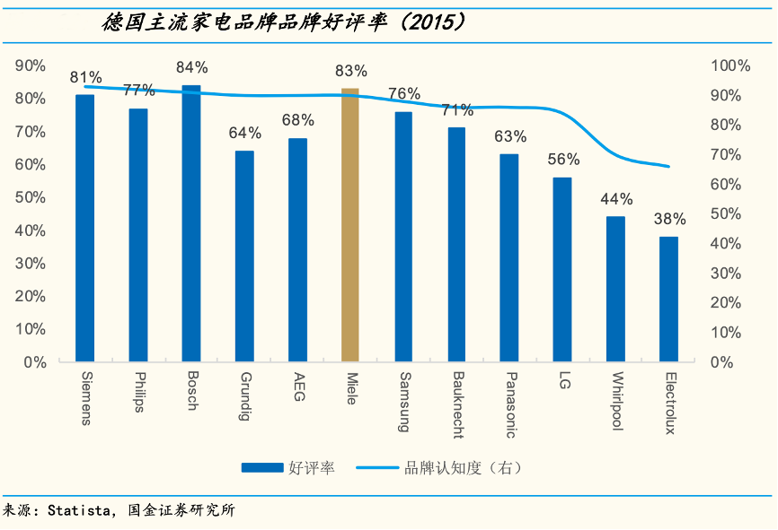 經(jīng)典案例:根據(jù)Statista、國金證券研究所等綜合資訊表明,Mile在產(chǎn)品力+售后優(yōu)勢(shì)下,復(fù)購率和滿意度高。根據(jù)Statista,2015年德國的主流家電品牌品牌好評(píng)率榜中,Miele以83%的好評(píng)率位居第二,優(yōu)勢(shì)明顯。