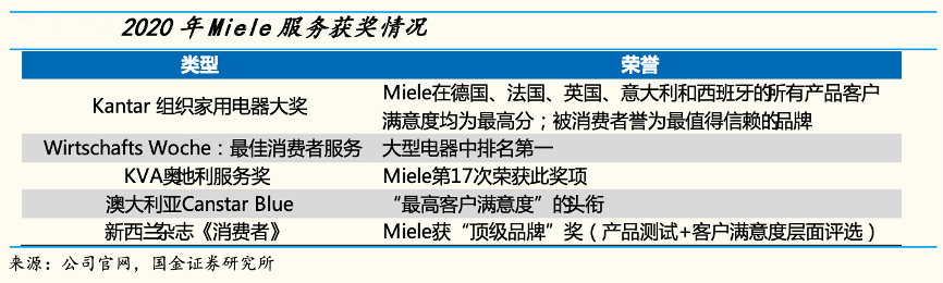 經(jīng)典案例:根據(jù)公司官網(wǎng)、國金證券研究所等綜合資訊表明,Miele 總共有約 2500 名售后服務(wù)人員,他們定期接受嚴(yán)格的培訓(xùn),并完成電話接聽和上門維系 等工作。其對(duì)員工有“首次呼叫完成率”(首次服務(wù)呼叫后完成的服務(wù)請(qǐng)求的百分比) 的嚴(yán)格要求,公司德國區(qū)首次呼叫完成率為 90%,高于行業(yè)平均水平。其每年都獲得個(gè)質(zhì)量和服務(wù)獎(jiǎng)項(xiàng)。