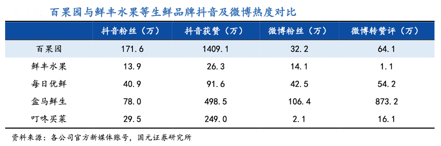 經典案例:根據各公司官方新媒體帳號、國元證券研究所等綜合資訊表明,百果園多渠道開展營銷活動,全方位觸及消費者。其利用手機APP、微信小程序、社區微信群以及朋友圈等線上渠道主動把握私域流量,目前已建立約 1.7 萬個社區微信群,面向 540 多萬社區微信粉絲推送趣味性、互動性強的產品促銷及會員活動;同時,借助抖音、微博等社交平臺,以直播、短視頻等形式開拓線上公域流量,擴大消費者基礎。