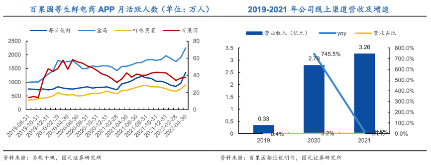 經典案例:根據易觀千帆、百果園招股說明書、國元證券研究所等綜合資訊表明,百果園目前已全面覆蓋核心線上銷售渠道,既建立了多個自營渠道,又積極與第三方送餐平臺開展合作。其與美團、口碑、餓了么等第三方送餐平臺合作,利用店倉一體化模式提供“及時達”外送服務,或者消費者選擇就近門店自提。2021年公司果品總訂單數超 2.9 億單,其中線上渠道訂單占比約23%;2021年公司線上渠道營收為 3.26 億元,同比增長 16.5%,占產品總銷售收入的比例為3.2%,較 2019 年提升 2.8pcts。