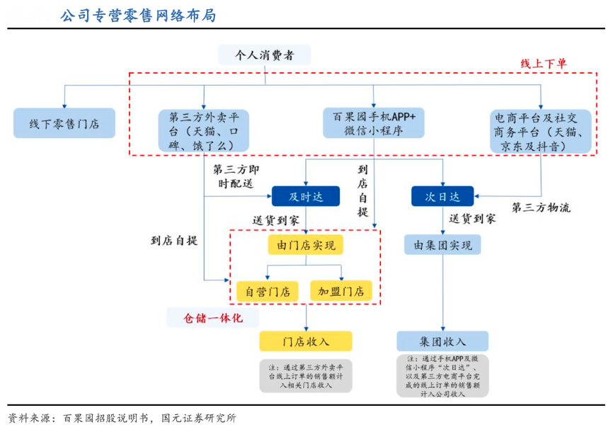 經典案例:根據百果園招股說明書、國元證券研究所等綜合資訊表明,近年來百果園公司從貼近社區、線上線下一體化以及 店倉一體化等方面入手持續優化水果專營零售網絡,為消費者帶來高效便利的購物體驗。其積極探索線上線下一體化,通過“次日達”或門店提貨實現的線上預售渠道幫助線下門店降低易腐爛果品庫存的同時,消費者線上購物、到店自提的行為也向線下門店引流部分客戶,帶來消費新增量。