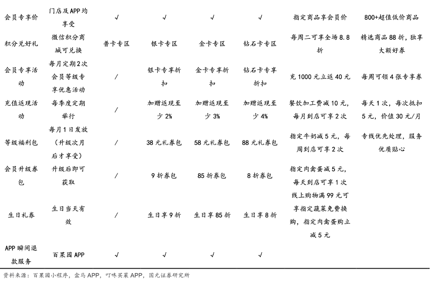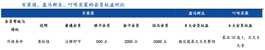 經典案例:根據百果園小程序、盒馬APP、叮咚買菜APP、國元證券研究所等綜合資訊表明,百果園將會員劃分為四個級別進而提供差異化服務,會員可通過積累購買金額提升等級,解鎖各種權益優惠,例如額外折扣、獨家促銷券以及會員兌換等。截至 2021 年,公司共計擁有超 6700 萬名會員,其中付費會員人數超 78 萬,平均月活會員數超 700 萬。