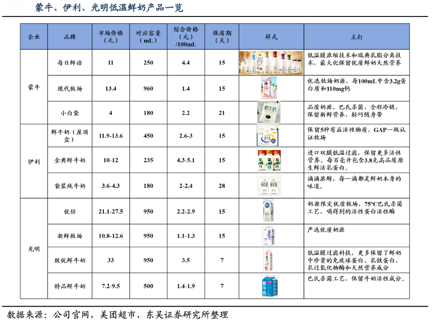 經典案例:根據公司官網、美團超市、東吳證券研究所等綜合資訊表明,全國乳企打造高端產品線,區域性乳企強調“鮮”價值。2018 年,蒙牛和伊利相繼 推出低溫鮮奶產品。蒙牛通過每日鮮語和現代牧場打造高端和中端產品線,按收入計 2021 年市占率達 13.4%。而光明旗下致優和特品保質期為 7 天,保留更多營養成分;新乳業開辟黃金 24 小時系列,強化極致新鮮理念。
