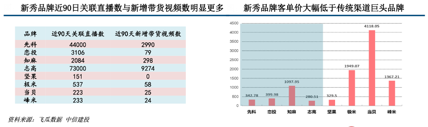 經(jīng)典案例:根據(jù)飛瓜數(shù)據(jù)、中信建投等綜合資訊表明,對(duì)比新秀品牌與傳統(tǒng)渠道巨頭品牌比直播場(chǎng)次、新增帶貨短視頻數(shù)數(shù)據(jù),新秀品牌均明顯領(lǐng)先。