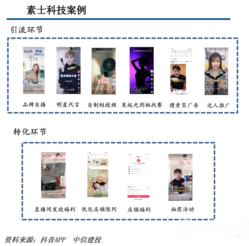 經(jīng)典案例:根據(jù)抖音APP、中信建投等綜合資訊表明,素士科技起步階段完成了運(yùn)營(yíng)模式的探索,同時(shí)引入了店鋪的首批目標(biāo)客戶群。進(jìn)入到成長(zhǎng)階段的品 牌,關(guān)鍵在于基于摸索出的運(yùn)營(yíng)模式實(shí)現(xiàn)GMV的迅速擴(kuò)大。尤其是在轉(zhuǎn)化環(huán)節(jié),品牌則應(yīng)在原有基礎(chǔ)上繼續(xù)優(yōu)化直播間、店鋪的運(yùn)營(yíng)。此外,在這一階段,品牌通常可以通過“爆款搭售其他產(chǎn)品”的方式適當(dāng)提升客單價(jià),從而進(jìn)一步促進(jìn)GMV的提升。