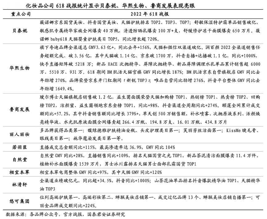 經典案例:根據各品牌公眾號、官方戰報、國海證券研究所等綜合資訊表明,貝泰妮旗下薇諾娜在維持穩定價格體系下天貓 GMV 超 4 億,位列天貓 護膚 TOP7,同比+30-50%維持較快增長,明星單品凍干面膜、防曬 2 支裝、特護霜 2 支裝月銷量 10w+、10w+、6w+,抖音 GMV 超 4000 萬元, 同比翻倍以上增長。