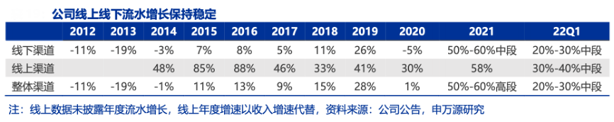 經(jīng)典案例:根據(jù)公司公告、申萬(wàn)宏源研究等綜合資訊表明,李寧公司自 2015 年啟動(dòng)新一輪改革以來(lái),終端流水持續(xù)快速增長(zhǎng),尤其是在 2018 年后增速斜率明顯抬升,除了2020年受疫情影響增速回落外,其余年份均維持強(qiáng)勁上漲態(tài)勢(shì)。其中,線上渠道常年在30%以上的高位。