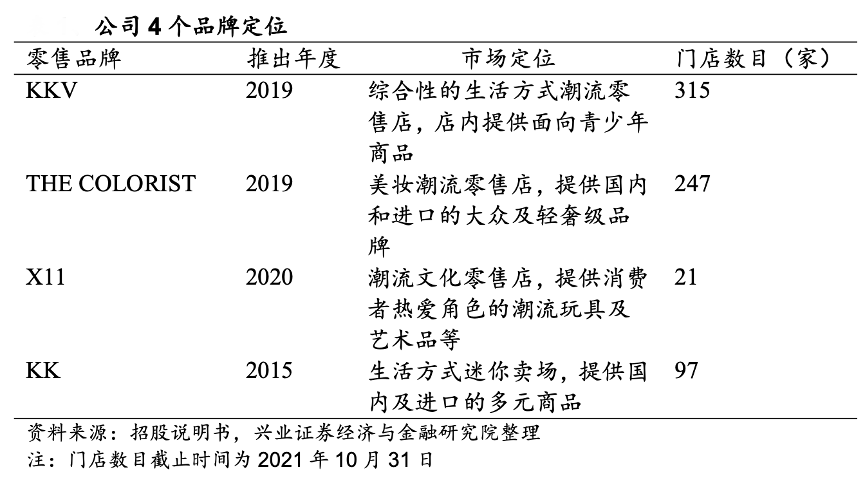 經典案例:根據招股說明書、興業證券經濟與金融研究院等綜合資訊表明,KK集團公司以“四個零售品牌”向消費者提供橫跨 18 個主要品類中超過 20,000 個 SKU 的各種潮流產品,涵蓋美妝、潮玩、食品及飲品、家居品、文具等所有主要核心生活用品類別,實現廣大的消費者觸及。