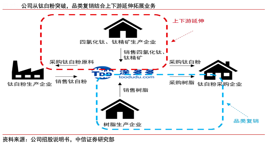經(jīng)典案例:根據(jù)公司招股說明書、中信證券研究部等綜合資訊表明,國聯(lián)股份涂多多在進入鈦行業(yè)時,先將鈦白粉作為核心單品進行突破,發(fā)展了一批鈦白粉生產上游企業(yè)和需要鈦白粉的塑料、涂料生產的下游企業(yè)作為客戶。公司在采購銷售鈦白粉的基礎上,與鈦白粉生產商建立了良好的合作關系,捕捉到鈦白粉生產商對四氯化碳和鈦精礦等產品的需求,從而將四氯化碳和鈦精礦納入涂多多的采購體系,低成本擴展公司業(yè)務和客戶。