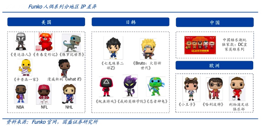 經典案例:根據FunKo官網、國盛證券研究所等綜合資訊表明,Funko抓住各地區潮流影視 IP,日韓市場表現突出的包括《魷魚游戲》(2021)、《我的英雄學院》(2016)等。北美市場中美國 IP 產出豐富,涵蓋影視、體育、音樂等多領域流行熱點。對比體育領域,美國熱門賽事包括 NBA、NFL、NHL 等,而歐洲熱門賽事圍繞足球為核心,赫赫有名的利物浦足球俱樂部因此成為 Funko 歐洲系列限定款。