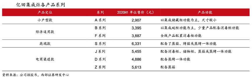 經(jīng)典案例:根據(jù)公司招股書、西部證券研發(fā)中心等綜合資訊表明,目前億田智能公司集成灶主要包括蒸烤獨(dú)立、蒸烤一體、蒸 箱和消毒柜四大品類,按產(chǎn)品定位分為小戶型款、經(jīng)濟(jì)適用款、高端款和電 商渠道款,價(jià)格帶覆蓋較廣。2018年以來,公司重點(diǎn)布局高端 S 系列,陸續(xù)推出 S8 系列蒸烤獨(dú)立集成灶和 S9 冰蒸一體智能烹飪管家,憑借突出產(chǎn)品力持續(xù)抬升公司整體價(jià)格帶。