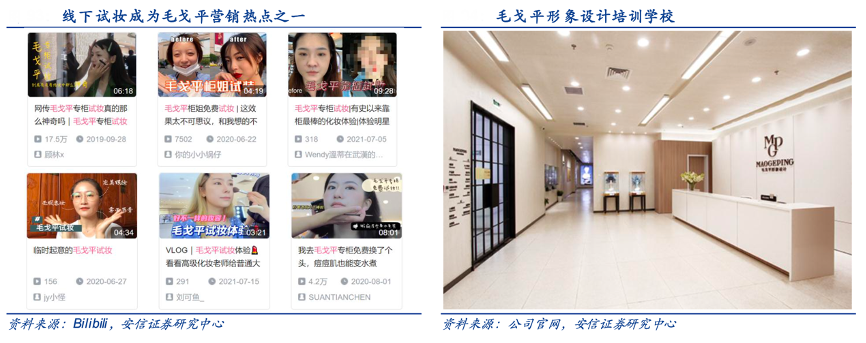 經(jīng)典案例:根據(jù)Billbill、公司官網(wǎng)、安信證券研究中心等綜合資訊表明,結(jié)合 CBNData,截至 2020 年 4 月,MGPIN 共有 244 家線下專柜,營收占比達到 70%-80%。每家專柜都提供試妝服務(wù),一方面讓客戶通過體驗妝效感受產(chǎn)品品質(zhì),幫助其選擇適合的產(chǎn)品,另一方面挖掘潛在需求,培養(yǎng)彩妝消費習(xí)慣,增強客戶粘性和復(fù)購率。