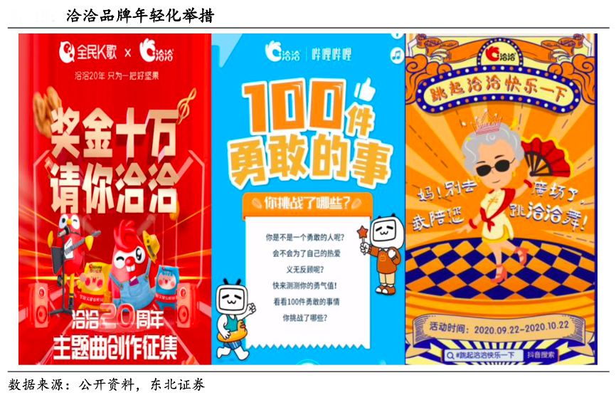經(jīng)典案例:根據(jù)公開資料、東北證券等綜合資訊表明,近年來(lái),隨著以 Z 世代為代表的年輕消費(fèi)群體日益壯大,洽洽與時(shí)俱進(jìn)展開品牌年輕化轉(zhuǎn)型。2021 年公司陸續(xù)與元?dú)馍帧eep合作推出聯(lián)名禮盒及單品,深受年輕消費(fèi)者歡迎,并且與全民 K 歌、B 站、 抖音等在年輕群體中極具影響力的娛樂休閑及社交平臺(tái)合作舉行洽洽20 周年主題 曲征集、風(fēng)味瓜子視頻創(chuàng)作大賽、舞王挑戰(zhàn)賽等活動(dòng),吸引年輕消費(fèi)群體關(guān)注。