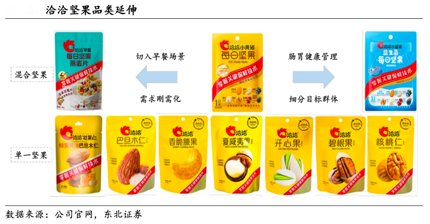 經(jīng)典案例:根據(jù)公司官網(wǎng)、東北證券等綜合資訊表明,目前洽洽公司堅(jiān)果產(chǎn)品矩陣由小黃袋每日?qǐng)?jiān)果、堅(jiān)果燕麥片及益生菌每日?qǐng)?jiān)果組成,公司以每日?qǐng)?jiān)果為核心單品,從功能性、口感風(fēng)味等角度進(jìn)行產(chǎn)品矩陣延伸,2020年推出的每日?qǐng)?jiān)果燕麥片瞄準(zhǔn)早餐剛需場(chǎng)景,而益生菌每日?qǐng)?jiān)果則切入學(xué)生兒童、孕婦等細(xì)分人群,進(jìn)一步拓展堅(jiān)果產(chǎn)品的消費(fèi)場(chǎng)景,擴(kuò)大消費(fèi)人群。憑借強(qiáng)大的渠道推力與協(xié)同效應(yīng),2021年公司每日?qǐng)?jiān)果小黃袋營(yíng)收額接近10 億,燕麥片及益生菌每日?qǐng)?jiān)果營(yíng)收均破億。