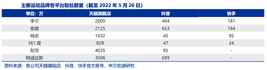 經(jīng)典案例:根據(jù)各公司天貓旗艦店、抖音、快手官方帳號(hào)、申萬(wàn)宏源研究等綜合資訊表明,李寧公司線(xiàn)上布局從天貓為主轉(zhuǎn)向天貓、抖音、 微信小程序、唯品會(huì)等多渠道全覆蓋,以直播帶貨等方式與消 費(fèi)者進(jìn)行高頻率互動(dòng),會(huì)員粘性持續(xù)提升。2021年公司電商會(huì)員數(shù)量突破 4000 萬(wàn),會(huì)員銷(xiāo)售貢獻(xiàn)提升 10-20%。從各平臺(tái)的粉絲數(shù)量看,截至到 2022 年 5 月 26 日,李寧天貓旗艦店粉絲數(shù)量高達(dá) 2600 萬(wàn)人,居主要國(guó)產(chǎn)運(yùn)動(dòng)品牌首位。