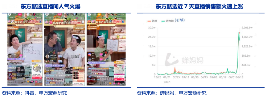 經(jīng)典案例:根據(jù)抖音、蟬媽媽、申萬宏源研究等綜合資訊表明,6月 11 日新東方前英語老師董宇輝的一場牛排帶貨讓東方甄選直播間爆火出圈,單日銷售突破 2000 萬。據(jù)蟬媽媽數(shù)據(jù),6 月 10 日至 13 日,東方甄選直播觀看人次均達 900 萬以上,6 月 13 日更是達到 1607.1 萬人, 抖音賬號粉絲從 110.8 萬人增長 242.5%至 379.5 萬人。東方甄選的出圈強勢拉動新東方股價上漲超 30%(6 月 14 日收盤價 VS 6 月 10 日收盤價)。