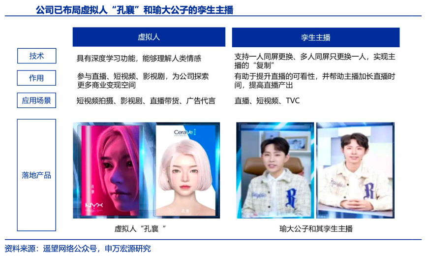 經(jīng)典案例:根據(jù)遙望網(wǎng)絡(luò)公眾號、申萬宏源研究等綜合資訊表明,遙望網(wǎng)絡(luò)公司組建了 20 人的 CG 研發(fā)團隊在數(shù)字虛擬人領(lǐng)域進行研發(fā)與制作,2022 年 4 月,公司發(fā)布虛擬人“孔襄”,已與賈乃亮進行短劇合作,并接到適樂膚、薇姿、NYX 三個品牌的代言,數(shù)次登上社交媒體熱搜榜。