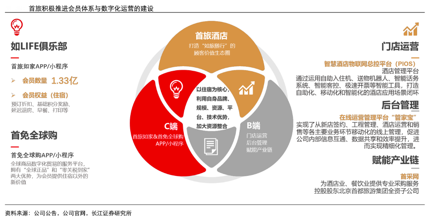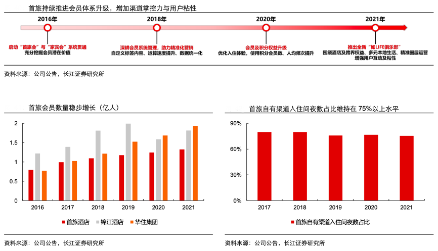 經典案例:根據公司公告、長江證券研究所等綜合資訊表明,自2016年首旅酒家與如家完成合并后,其積極整合資源,對會員體系進行迭代, 并針對會員推出首免全球購,變現渠道拓寬,會員體量與粘性不斷提升。其于2016 年啟動“首旅會”與“家賓會”系統整合,2020 年進行會員權益升級,并于 2021 年推 出全新會員體系“如 LIFE 俱樂部”,圍繞酒店及跨界權益、多元本地生活進行精準運營。