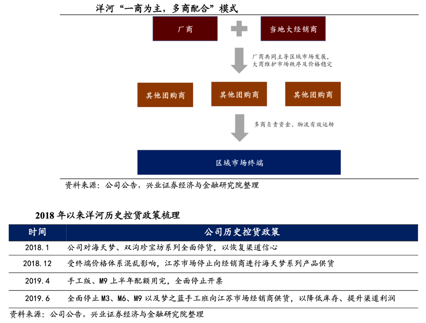 經典案例:根據公司公告、興業證券經濟與金融研究院等綜合資訊表明,洋河在渠道模式上,針對過去多商并存但管控不利的局面,其構建“一商為主、多商為輔”的新型廠商關系,充分調動大商積極性。