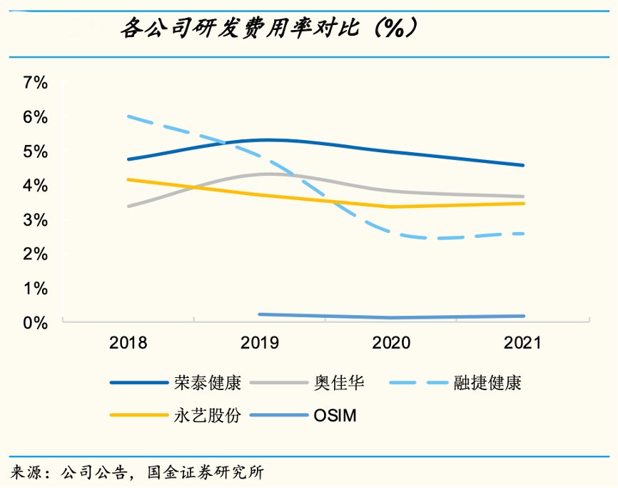 經典案例:根據公司公告、國金證券研究所等綜合資訊表明,榮泰健康研發保持高投入,2021年其研發投入為1.2 億元,占營收比重為 4.6%,在行業可比公司中最高,奧佳華、融捷健康、永藝股份,分別為 3.7%、2.6%、3.4%,外資龍頭 OSIM 研發費用率僅為 0.18%,研發費用率和絕對研發投入都與內資品牌形成較大差距。