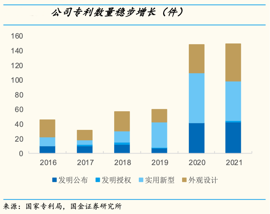 經典案例:根據國家專利局、國金證券研究所等綜合資訊表明,2020-2021年榮泰健康公司專利數量顯著增加至150 件左右/年,其中含金量最高的發明專利(發明公布+授權) 數量快速上升。