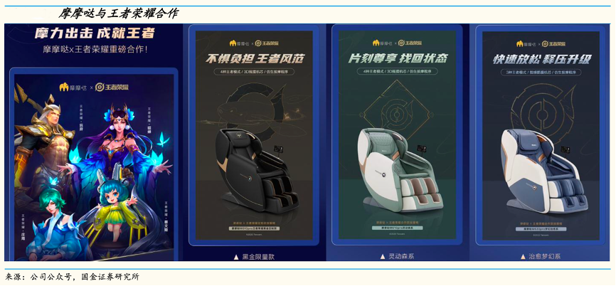 2022年5月,摩摩噠和王者榮耀合作發布英雄系列按摩椅,推出黑金限量款、靈動森系、治愈夢幻系三款產品,成為舒適破圈的一次成功嘗試。