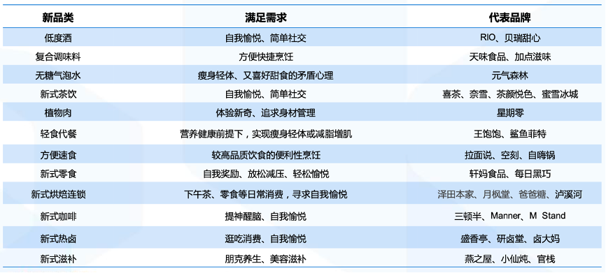 經(jīng)典案例:根據(jù)各公司網(wǎng)站、國泰君安證券研究等綜合資訊表明,各新消費品代表品牌紛紛創(chuàng)新品類,滿足用戶的各類消費新需求,以此搶占新消費市場。