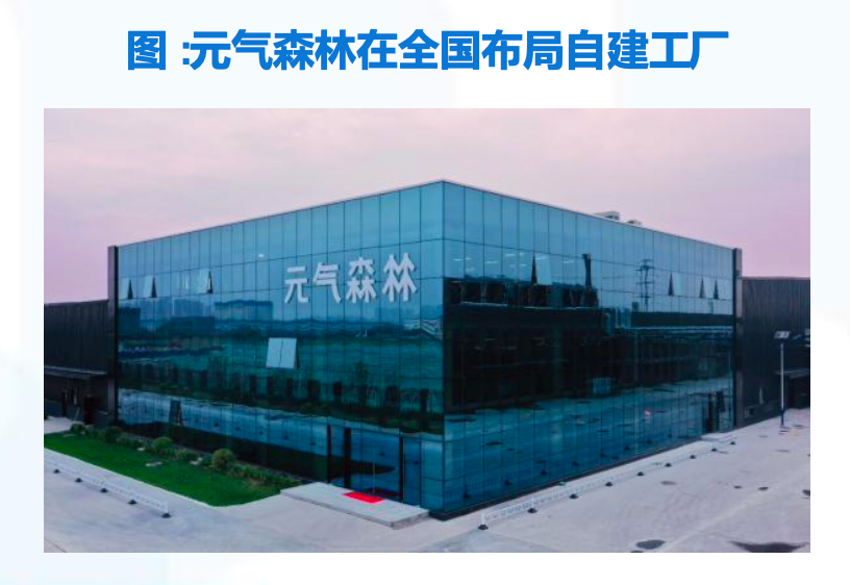 經(jīng)典案例:根據(jù)公司網(wǎng)站、國泰君安證券研究等綜合資訊表明,元?dú)馍种饕a(chǎn)品包括無糖氣泡水(元?dú)馍?/無糖奶茶(乳茶),其他產(chǎn)品覆蓋茶飲料、功能性飲料、果汁飲料、電解質(zhì)飲料等多個(gè)品類。自2019年開始,元?dú)馍珠_始在全國布局自建工廠,先后在安徽滁州、廣東肇慶、天津西青、湖北咸寧、 四川都江堰等地籌建工廠并陸續(xù)投產(chǎn)。5大工廠總投資55億元,分別對(duì)應(yīng)華東、華南、華北、華中、西南地區(qū)5大城市集群。
