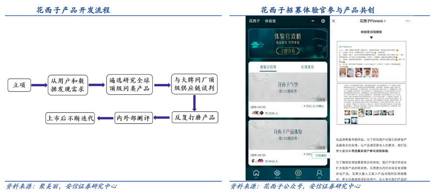 經典案例:根據聚美麗、花西子公眾號、安信證券研究中心等綜合資訊表明,花西子在公眾號、微博、天貓店鋪等平臺發布體驗官招募信息,邀請用戶成為體驗館參與產品測評,反饋使用感受,截至 2021.11 已發布體驗官招募 131 期,每期申請人數在 1500-4500 人。通過實時跟進用戶反饋進行產品升級,四年里歷經了眉筆 8 次迭代、蜜粉 4 次更新、眼 線筆 3 次升級,切實滿足消費者需要。