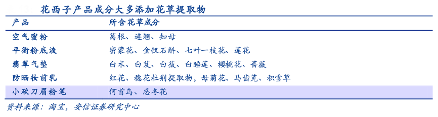 經典案例:根據淘寶、安信證券研究中心等綜合資訊表明,花西子在外觀設計上均采用東方美學元素,包裝以黛色為基調,將園林軒窗、同心鎖、傳統雕花工藝、百鳥朝鳳等元素運用于產品外觀中。同時其踐行“以花養膚”的理念,其產品成分大多添加了對皮膚有益的花草提取物,溫和養膚。例如蜜粉中添加葛根、連翹、知母等;口紅采用“花露胭脂”古方,添加上好花瓣;眉筆汲取“螺子黛”靈感,融入何首烏、忍冬花等成分,產品差異化突出。