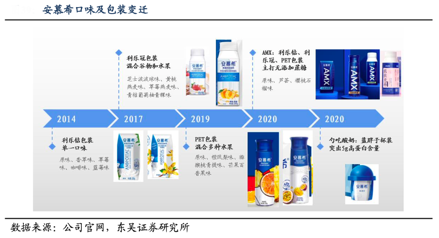 經典案例:根據公司官網、東吳證券研究所等綜合資訊表明,2005年蒙牛推出特侖蘇,成為中國首個高端乳品品牌。安慕希口味及包裝日益升級,持續(xù)提升產品價值。同時高端奶的蛋白質含量達 3.8g-4g/100g,高于國家標準2.8g/100g,營養(yǎng)價值更高。龍頭推出高端奶基礎款產品后,持續(xù)打造有機系列、夢幻蓋系列,進行品質升級與包裝升級。
