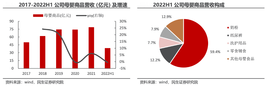 經典案例:根據wind、民生證券研究院等綜合資訊表明,孩子王公司銷售產品覆蓋食品、衣物品、易耗品、耐用品等多個品類,產品品種逾萬種,且銷售的商品以中高端品牌為主,合作品牌有惠氏、雅培、swisse、巴拉巴拉等。2021 年/2022H1,公司母嬰商品營業收入為 78.35/38.43 億元。