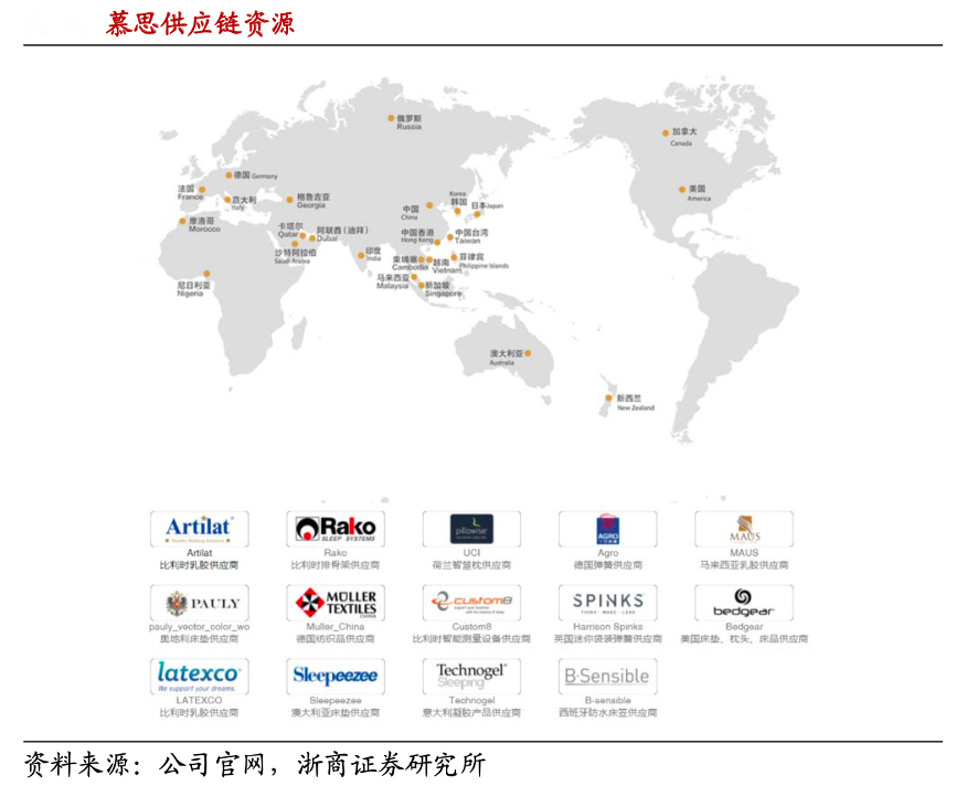經(jīng)典案例:根據(jù)公司官網(wǎng)、浙商證券研究所等綜合資訊表明,慕思與德國(guó) Agro 彈簧供應(yīng)商、美國(guó) Bedgear 床墊、枕頭、床品供應(yīng) 商、意大利 Technogel 凝膠供應(yīng)商建立穩(wěn)定的長(zhǎng)期合作協(xié)議,采購(gòu)優(yōu)質(zhì)原材料,引進(jìn)世界先進(jìn)的寢具制造材料和技術(shù),實(shí)現(xiàn)產(chǎn)品質(zhì)量的有力的保障、產(chǎn)品技術(shù)的不斷革新與迭代。