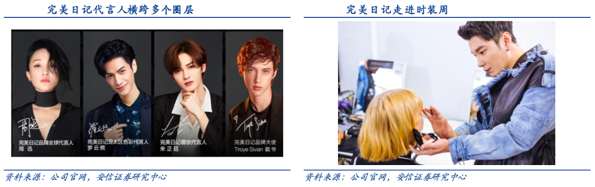 經(jīng)典案例:根據(jù)公司官網(wǎng)、安信證券研究中心等綜合資訊表明,在品牌代言人的選擇上,完美日記選擇周迅和戳爺作為全系列的全球代言人、品牌大使,推動品牌調(diào)性和知名度的提升;選擇羅云熙、朱正廷、賴冠霖等擁有眾多年輕女性粉絲的流量明星分別代言色彩、唇妝、底妝產(chǎn)品線。為擴(kuò)大時尚影響力,其與米蘭時裝周、巴黎時裝周、上海時裝周等建立合作,通過海外博主的分享在海外時尚圈嶄露頭角。