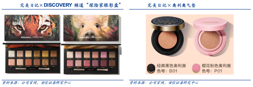 經(jīng)典案例:根據(jù)公司官網(wǎng)、安信證券研究中心等綜合資訊表明,完美日記推出聯(lián)名產(chǎn)品頻率極高,包括大英博物館、DISCOVERY 頻道、中國國家地理、大都會藝術(shù)博物館以及三麗鷗、奧利奧等。其以“探險家十二色眼影盤”為例,其 抓住動物保護(hù)這一話題熱點(diǎn),分別以小豬、鱷魚、冰狼、斑虎為靈感推出四種色系的“野性”眼影盤,引發(fā)熱議,剛發(fā)售時一周銷量超過二十萬。