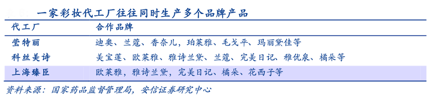 經典案例:根據國家藥品監督管理局、安信證券研究中心等綜合資訊表明,包括科絲美詩、瑩特麗、上海臻臣、諾斯貝爾等在內的代工廠往往會生產多個品牌的產品,因此“平替”頻出。對于低端彩妝,消費者對溢價敏感度高,一旦產品提價超過心理預 期,就會尋找下一個“平替 ”,因此品牌調性高的高端彩妝品牌將擁有更高的競爭壁壘。