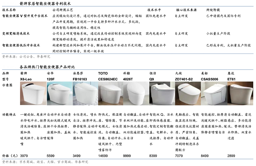 經典案例:根據公司公告、京東商城、淘寶、天貓、官方商城、華泰研究等綜合資訊表明,箭牌家居公司目前擁有三項自主研發的智能坐便器的工藝核心技術,其中兩項達到國內先進水平,一項達到國際先進水平。截至2022 年底,公司已取得專利共有 2343 項,其中授權發明專利 70 項,實用新型 2554 項,外觀設計 719 項。