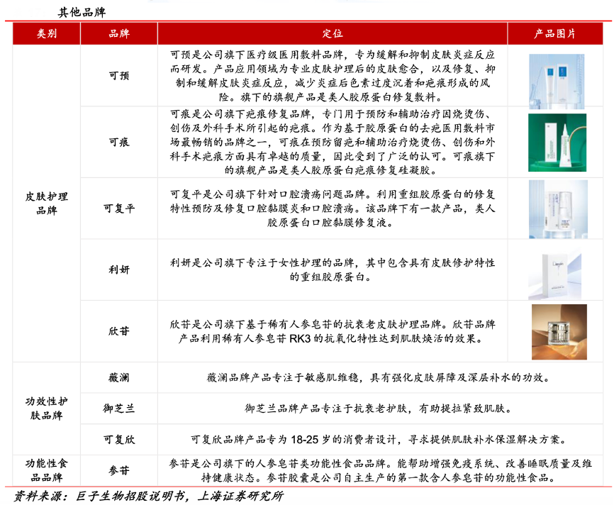 經典案例:根據巨子生物招股說明書、上海證券研究所等綜合資訊表明,除可復美和可麗金之外,巨子生物公司還擁有 5 個皮膚護理品牌、3 個 功效性護膚品牌和 1 個功能性食品品牌,涵蓋皮膚炎癥、疤痕修復、口腔護理等多個細分應用領域。其中,公司是 2021 年第二大基于 稀有人參皂苷技術的功能性食品公司,擁有近 24%的市場份額。