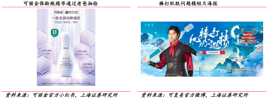 經典案例:根據可麗金官方小紅書、可復美官方微博、上海證券研究所等綜合資訊表明,巨子生物通過科普并與頭部達人合作,不斷優化與消費者之間的在線互動。公司與老爸評測等專業的測評類機構合作,對公司的產品進行功效及安全測試,傳遞產品可靠質量的信號。同時公司建立了獨特的直播矩陣,2022 年 2 月,可復美攜手孫天宇共同打造的創意 TVC 孫大圣棒打肌膚問題精,借明星勢能實現大眾范圍內的破圈,可復美微博相關話題收獲超過 2.4 億曝光。