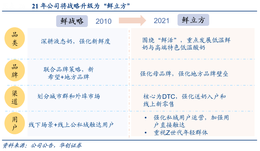 經典案例:根據公司公告、華創證券等綜合資訊表明,新乳業卡位“新鮮”與乳業巨頭形成差異化區隔,2021年公司進一步將“鮮戰略”升級為“鮮立方”,進一步明晰增長曲線:品類上,旗幟鮮明做大鮮奶這一高勢能品類,并圍繞“鮮活”重點發展低溫鮮奶與高端特色低溫酸奶;品牌上,強化母品牌的同時,突出地方品牌特色。